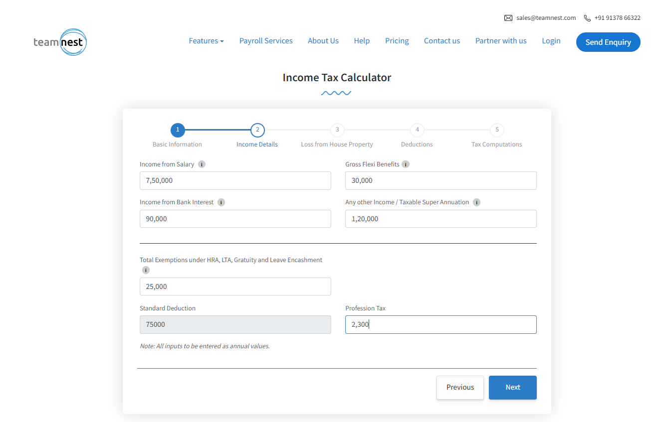 - On the second step, the employee will be able to add the Income Details where all the applicable values should be entered as annual amounts.