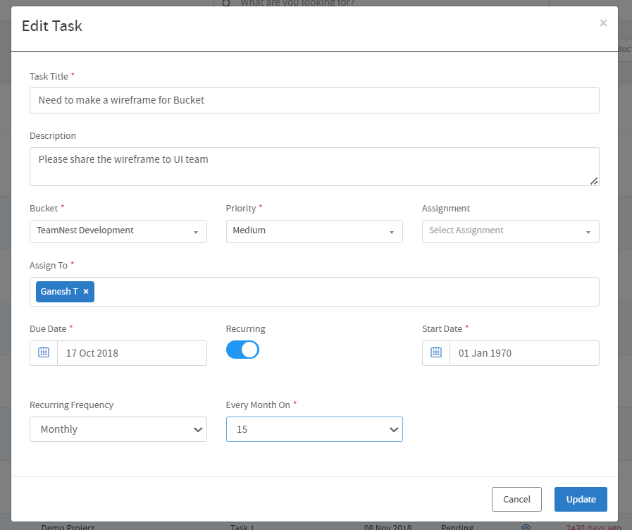 - Enter the name of the task. Select the appropriate Bucket it belongs to and set the Completion Date. Assign the task to the person responsible for carrying it out.