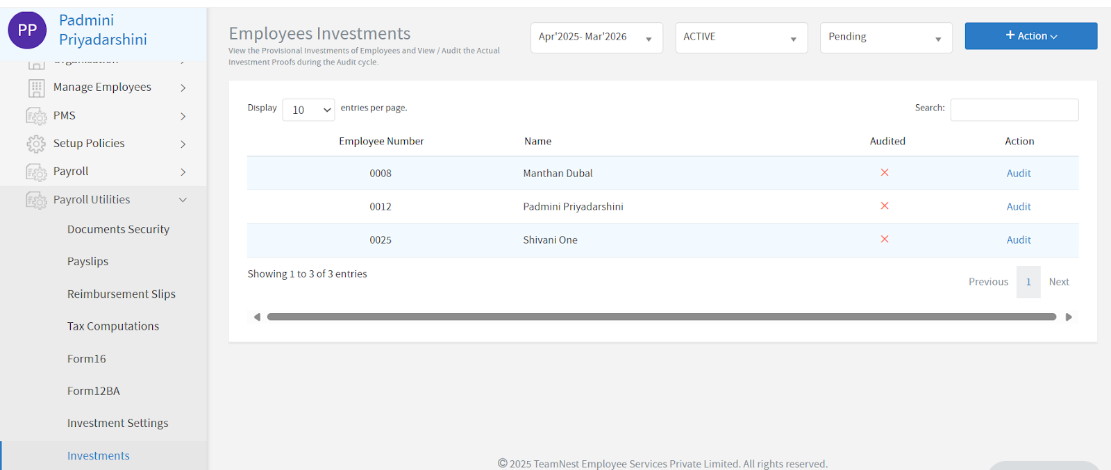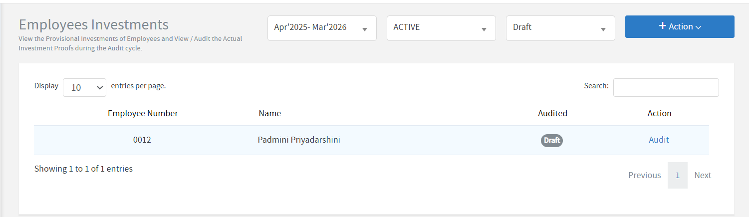 Admin Section > Payroll Utilities > Investments, to verify and audit all Employee Investments from a single page. By selecting the Pending filter (by the side of the Action button), the page will show all the unaudited investment cases that need to be audited. - Any Investments saved by the Employee under the Draft mode will appear by selecting the Draft filter. The Draft mode indicates the Employee will be adding more details to his or her investments.