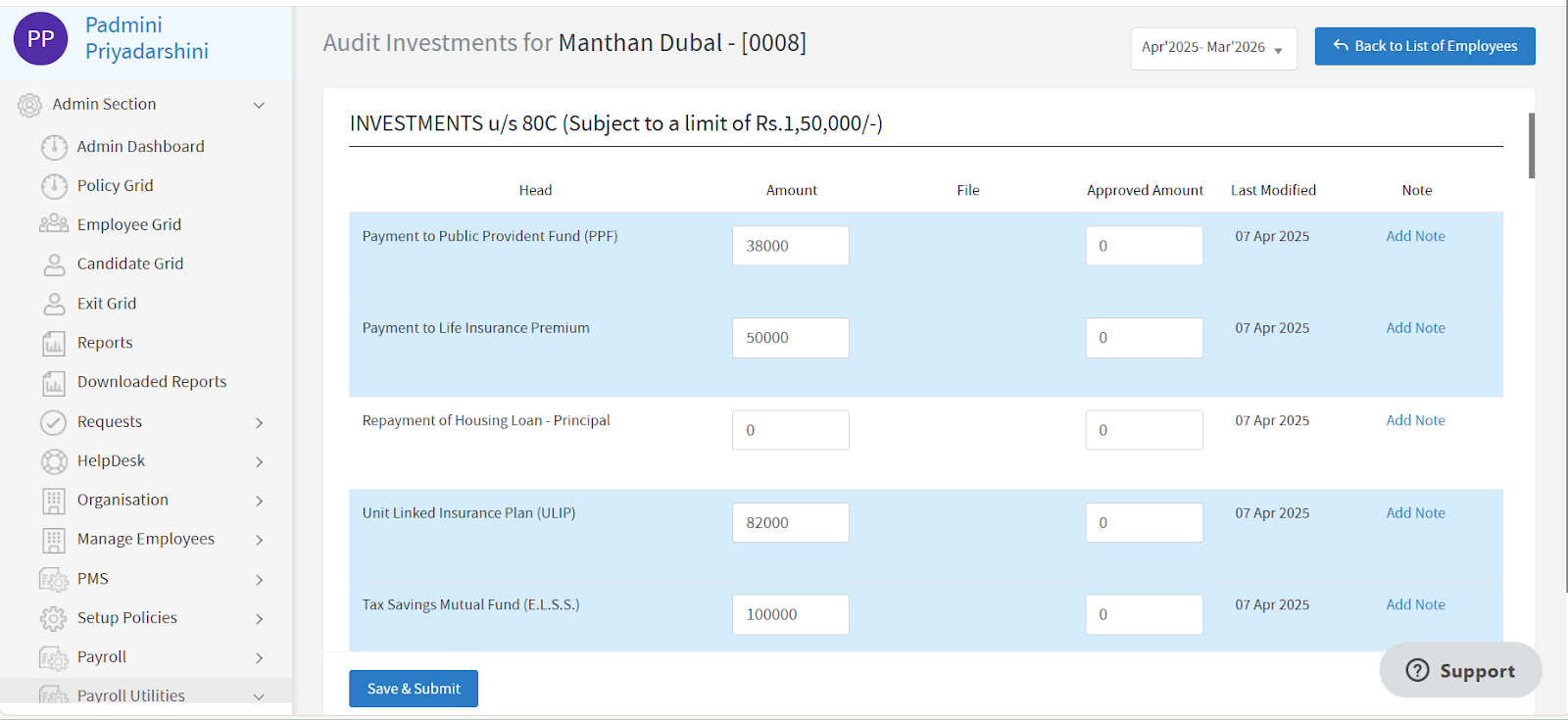 - The Administrator can view the declaration and the proof that was uploaded as supporting. After due checking, the Administrator can enter the approved amount for each applicable investment. They can also enter a note with reasons for an employee e.g. when the amount declared is only partially approved or completely rejected. This note will be visible to the employee. Once this process is completed the administrator will mark the Investment as Audited and click Save & Submit.