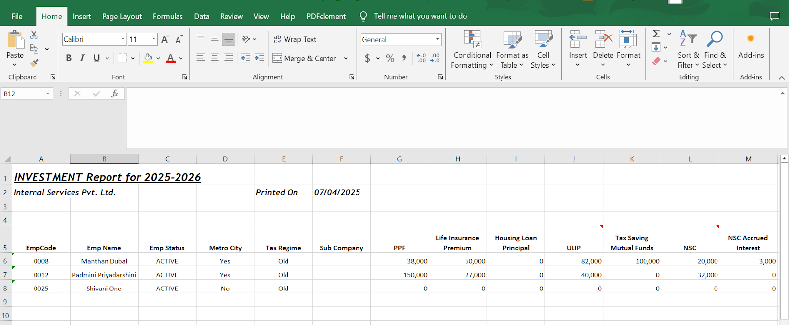 - The process will be repeated for all the pending investments for Auditing. At any point of time, the Administrator can download an Excel Report of the amount declared by the employee and the amount approved by the Auditor in a crosstab format.