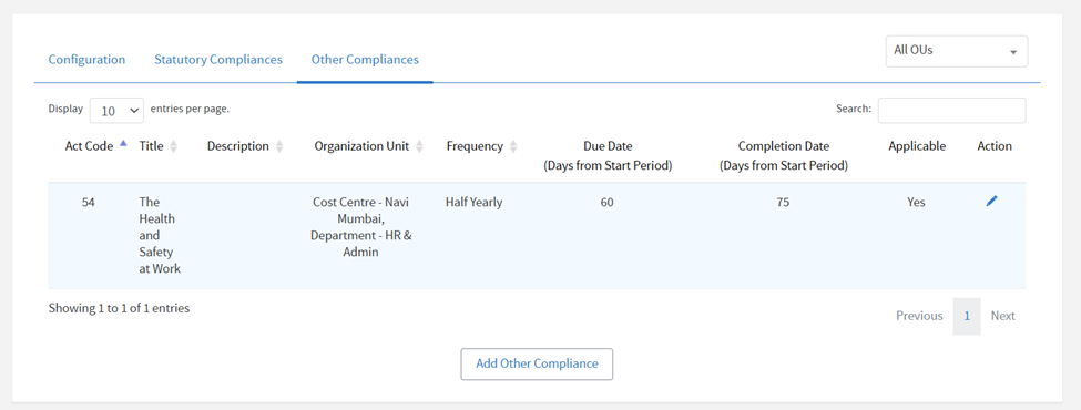 Organizations can now create Custom Compliance Masters tailored as per applicable laws, with flexibility to configure these at the sub-company level for a more comprehensive compliance management. This section can be accessed from Admin Section > Compliance > Compliance Details > Other Compliances tab.