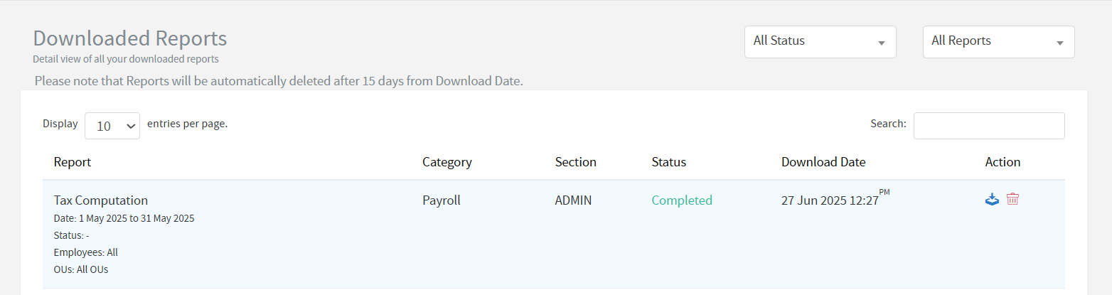 Tax Computation (Beta): This report can be downloaded in one go for all employees irrespective of the number of employees. Previously there was a restriction of a batch size of 100. The progress can be viewed under Downloaded Reports allowing you to continue your work without interruption while this downloads in the background. The download process is unaffected by page closure or session termination.