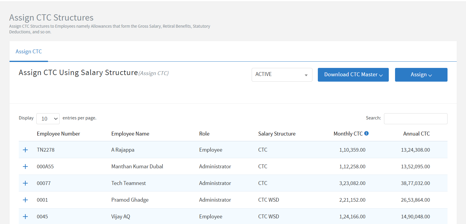 CTC Master Download: Admins can now extract the CTC Master file filtered by employee status (e.g., Active, On Hold, Resigned, etc.) for focused data analysis. This can be accessed under Admin Section > Manage Employees > Assign CTC Structures > Download CTC Master tab.